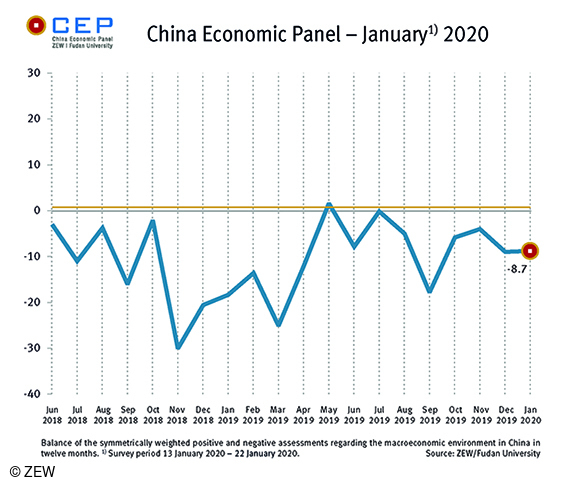 According to the most recent survey for January (13–22 January 2020), the expectations regarding the Chinese economy have remained almost unchanged. The CEP Indicator, which reflects the expectations of international financial market experts regarding China’s macroeconomic development over the coming twelve months, is currently at minus 8.7 points, 0.2 points higher than in the previous month (December 2019: minus 8.9 points). Since April 2018, the CEP indicator has thus remained in the negative almost without interruption