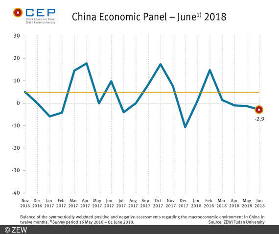 China Economic PanelAccording to the most recent survey for June (16/05/2018–01/06/2018), the economic outlook for China dropped slightly by 1.6 points to a new value of minus 2.9 points. This represents the fourth consecutive decrease in the CEP Indicator, which is currently well below the long-term average of 4.8 points. The CEP Indicator reflects the expectations of international financial market experts regarding China’s macroeconomic development over the coming twelve months.