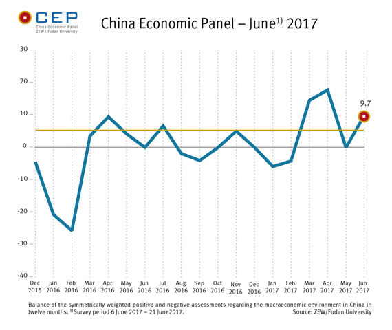 According to the current survey for June (6–21 June 2017), the economic outlook for China has once again improved significantly, rising by 9.8 points compared to the previous month. The CEP Indicator, which reflects the expectations of international financial market experts regarding China’s macroeconomic development over the coming twelve months, is currently at 9.7 points (May 2017: minus 0.1 points), thus once again rising above the long-term average of 5.3 points.
