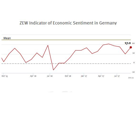 ZEW Indicator of Economic SentimentThe ZEW Indicator of Economic Sentiment for Germany improved in September 2017. Climbing 7.0 points compared to the previous month, the indicator now stands at 17.0 points. The indicator, however, still remains below the long-term average of 23.8 points.“The solid growth figures in the second quarter of 2017 in combination with a steep rise in bank lending and increasing investment activities by both the government and private firms are likely reasons for the financial market experts’ significantly more positive outlook compared to that of last month. Their expectations are further corroborated by stable global economic development. The German federal elections do not seem to have been a source of uncertainty. The worries about the recent strengthening of the euro has, for now, also faded into the background,” comments ZEW President Professor Achim Wambach.