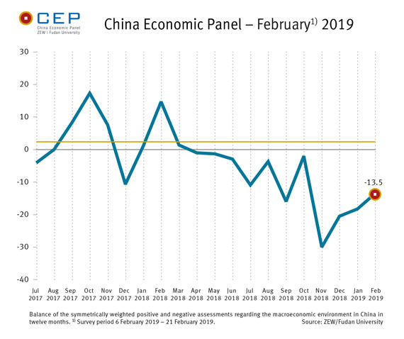 China Economic PanelAccording to the most recent survey for February (6–21 February 2019), the expectations regarding the Chinese economy have risen by 4.8 points to a reading of minus 13.5 points (January 2019: minus 18.3 points). Despite this renewed increase, the CEP Indicator, which is based on the China Economic Panel and reflects the expectations of international financial market experts regarding China’s macroeconomic development over the coming twelve months, is still in negative territory and remains well below the long-term average of 2.4 points.