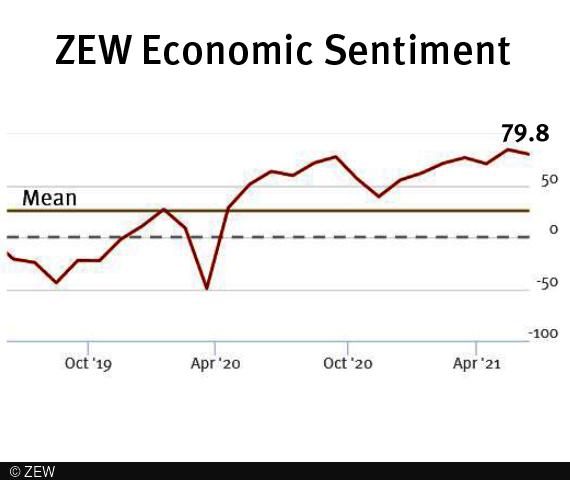 “The economic recovery is progressing. Although the ZEW Indicator of Economic Sentiment has experienced a drop in June, it remains at a very high level. The decline in expectations is probably largely due to the considerably better assessment of the economic situation, which is now back at pre-crisis levels. The financial market experts therefore continue to expect a strong economic recovery for the next six months,” comments ZEW President Professor Achim Wambach on current expectations.