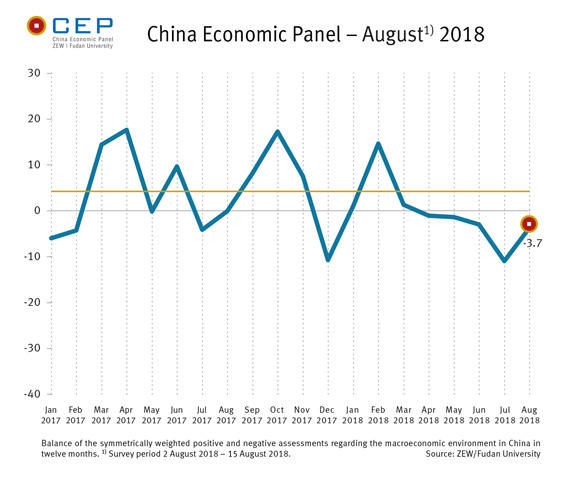 China Economic PanelAccording to the most recent survey in August (02/08/2018–15/08/2018), the economic outlook for China has recovered again after having declined considerably in the previous five months. The CEP Indicator, which reflects the expectations of international financial market experts regarding China’s macroeconomic development over the coming twelve months, is currently at minus 3.7 points (July 2018: minus 10.9 points). However, the CEP indicator is still well below the long-term average of 4.3 points. Climbing 1.7 points to a level of 9.3 points, the assessment of the current economic situation in China was also more positive than the previous month.