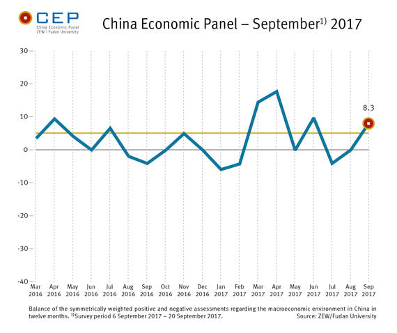 China Economic PanelAccording to the most recent survey for September (6–20 September 2017), the economic outlook for China has improved again, rising by 8.3 points. The CEP Indicator, which reflects the expectations of international financial market experts regarding China’s macroeconomic development over the coming twelve months, currently stands at 8.3 points (August 2017: 0.0 points), coming in once again slightly above the long-term average of 5.1 points.
