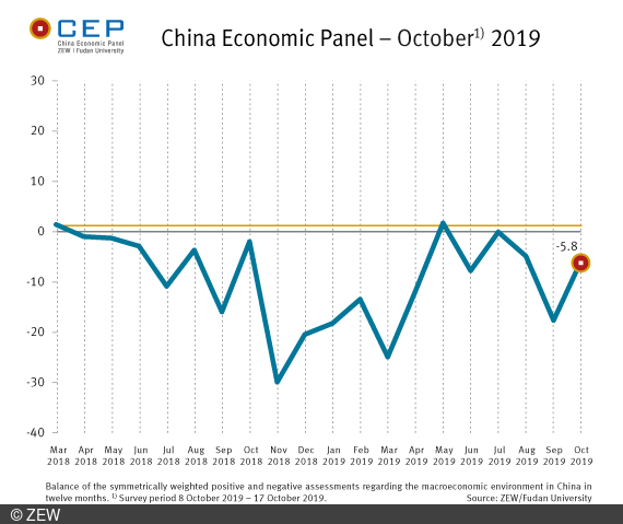 In the most recent survey for October (8–17 October 2019), the expectations regarding the Chinese economy have increased by 11.9 points. The CEP Indicator, which reflects the expectations of international financial market experts regarding China’s macroeconomic development over the coming twelve months, is currently at minus 5.8 points (September 2019: minus 17.7 points). Last month’s decline of 12.8 points was thus largely offset by the rise recorded in October.