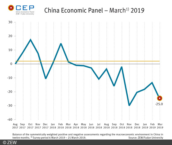 According to the most recent survey for March (6–21 March 2019), the expectations regarding the Chinese economy have decreased significantly by 11.5 points. The CEP Indicator, which is based on the China Economic Panel and reflects the expectations of international financial market experts regarding China’s macroeconomic development over the coming twelve months, is currently at minus 25.0 points (February 2019: minus 13.5 points). This marks the twelfth month in a row that the CEP indicator has been below its long-term average.