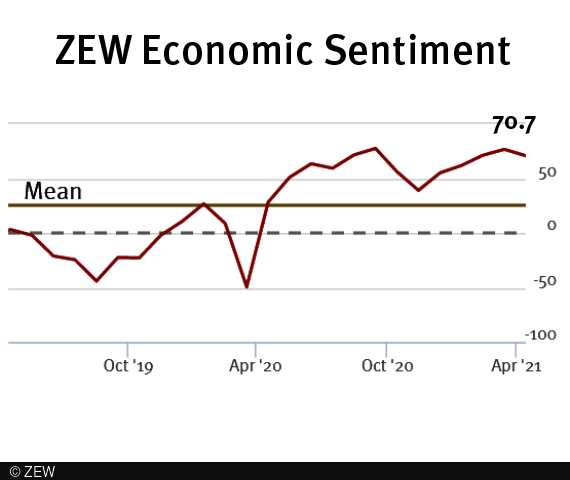 The ZEW Indicator of Economic Sentiment for Germany decreased in the current April 2021 survey, falling 5.9 points to a new reading of 70.7 points. This is the first time that the indicator has experienced a drop since November 2020. Expectations are still at a very high level.
