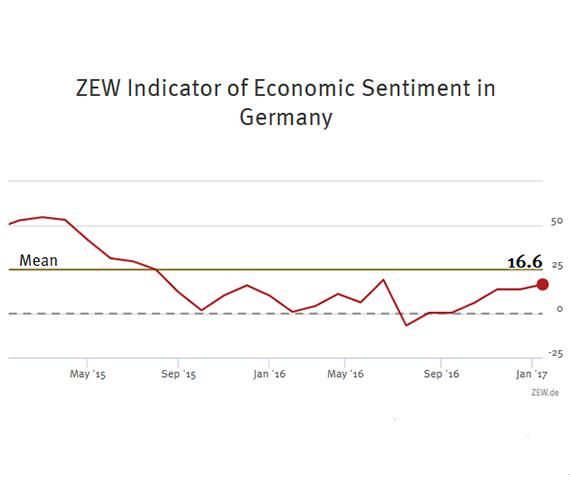 ZEW Indicator of Economic SentimentThe ZEW Indicator of Economic Sentiment for Germany has increased slightly in January 2017. The index has improved by 2.8 points compared to December, now standing at 16.6 points. "The slight increase of the ZEW Indicator of Economic Sentiment is mainly due the improved economic situation across European countries. The fairly good preliminary figures recorded for the development of the German GDP last year, as well as for the industrial production of the eurozone in November 2016, came as a surprise to many. This improvement in expectations can thus also be seen as a leap of faith for 2017," comments ZEW President Professor Achim Wambach.