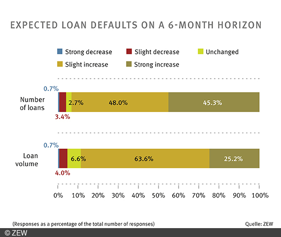 Unlike the global economic crisis of 2007/2008, which originated in the financial sector and spread to the real economy, the COVID-19 crisis is foremost a global health crisis. However, since combating the spread of the virus involves major economic cuts, this time there is a risk that the current crisis will spill over from the real economy into the banking sector. According to financial market experts, loan defaults in the German banking sector will increase in the first half of the year. 48 per cent of respondents expect a slight and 45 per cent a strong increase in the number of loan defaults, while 64 per cent (25 per cent) expect a slight (strong) increase in the volume of loans in default.