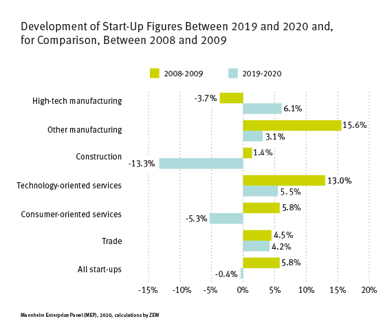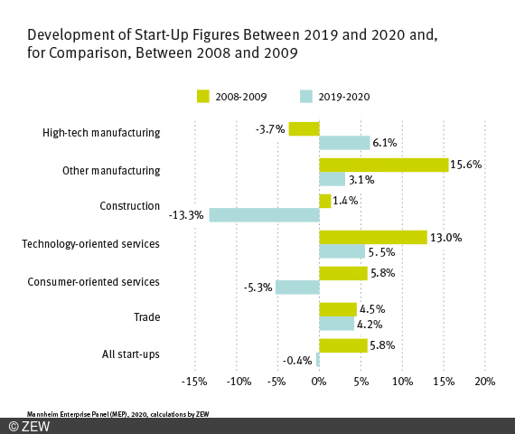 ResearchThe pandemic has only slightly slowed down the start-up activity in Germany in 2020. According to a joint study by Creditreform and ZEW Mannheim, almost 165,000 new companies were founded last year. However, the development varied greatly depending on the sector. Regardless of the COVID-19 crisis, the number of companies grew slightly last year to nearly 3.3 million. Once again, more companies were founded than closed. The Mannheim Enterprise Panel (MEP), conducted by ZEW, recorded around 156,000 firm closures, for example due to withdrawal from business or insolvency.