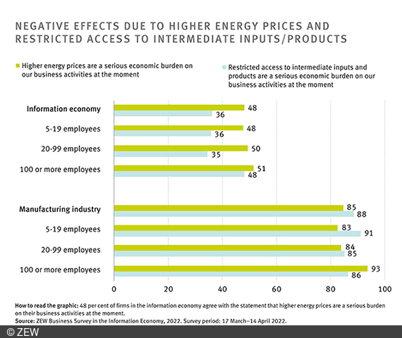 Firms in the information economy, which primarily includes the services sector, also report to be negatively affected by higher energy prices or supply chain disruptions. Almost one in two firms in the information economy states that higher energy prices are currently a serious burden on their business activities. This figure is consistent among all firm sizes. In the survey, 36 per cent of all firms report that restricted access to intermediate inputs and products is currently severely affecting their business activities. This percentage is similar for small and medium-sized firms. In contrast, about every second larger company with 100 or more employees agrees that limited access to intermediate inputs and products is currently a serious burden on their business activities.