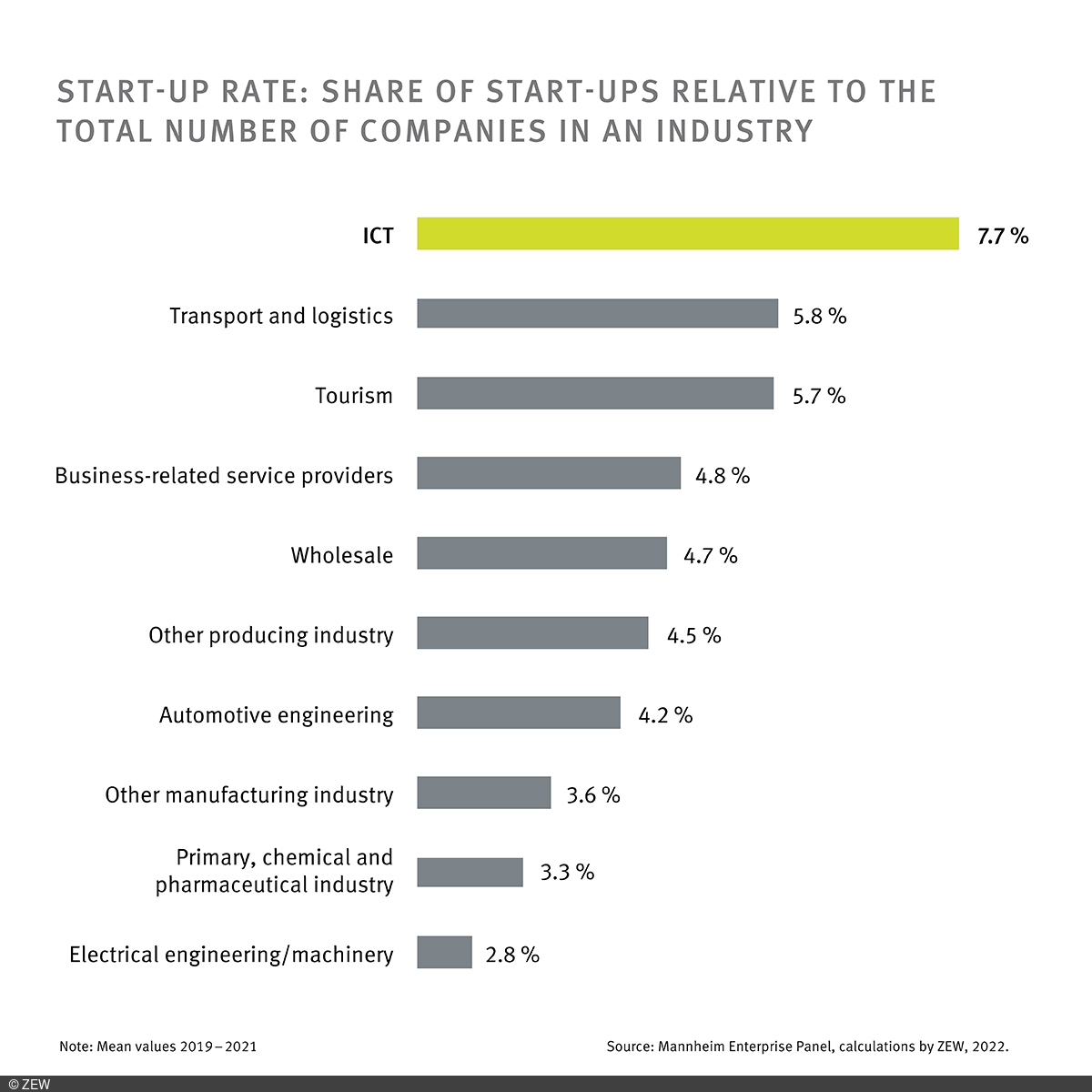 A particular strength of the ICT sector is its ability to innovate. This is reflected, for example, in the innovator rate, i.e. the proportion of companies that have introduced a new or considerably improved product or process in the last three years. With an innovator rate of about 80 per cent for the period 2018 to 2020, the ICT sector ranks first compared to other sectors, ahead of electrical engineering and machinery (around 77 per cent) as well as automotive engineering (75 per cent). The ICT sector also demonstrates its innovative strength in terms of the share of sales generated with market innovations. With a share of just under seven per cent, it ranks second among German industries and is only exceeded by automotive engineering (around 11.5 per cent). A further indicator of the innovation potential of a sector is the number of start-ups. With around 8,250 new companies and a start-up rate of just under 7.7 per cent over the last three years, the ICT sector comes in first place compared to other industries. The start-up rate measures the share of newly founded companies in relation to all companies in a sector. With 5.8 and 5.7 per cent, respectively, the transport and logistics sector and tourism record the second and third highest start-up rate. The trend of increasing start-up activity in the ICT sector has thus continued since 2017, although this is driven solely by ICT service providers.