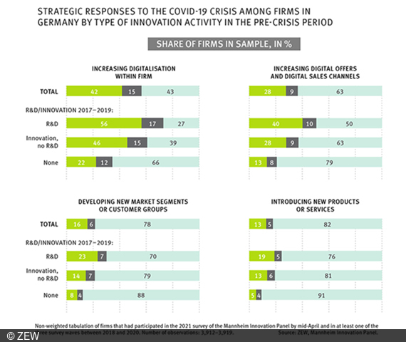 During the coronavirus crisis, highly innovative companies have proven to be quite resilient to the negative consequences of the pandemic. They sped up the digitalisation of internal processes and products, tried to conquer new markets and to attract new customers, and introduced new products and processes. These are all actions that help a company grow. “Furthermore, these measures are not implemented for a short period of time but rather permanently, which will strengthen businesses’ competitiveness for the years to come,” says Bastian Krieger, ZEW researcher and co-author of the survey. Non-innovative companies, on the other hand, hardly took any strategic measures in response to the coronavirus crisis.