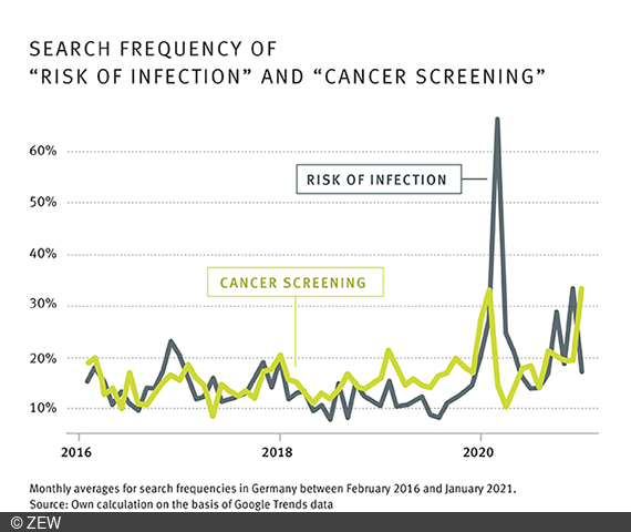 In a combined analysis of recent international studies and Google Trends data, Simon Reif and ZEW economist Sabrina Schubert show that demand for cancer screening tests is lower when infection rates are high. This relationship was found in several studies conducted in Germany, the USA and Great Britain. By analysing the frequency of Google search terms in Germany, the researchers found that the search frequency of “cancer screening” was lower when the frequency of “risk of infection” was high.