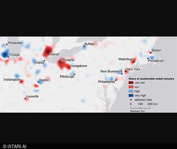 The map shows an example of the distribution of sustainable and non-sustainable metal industries in the north-east of the USA. There is a clear concentration of sustainable companies, especially in the north of Chicago, but also in Dayton, Pittsburgh and Buffalo, for example.