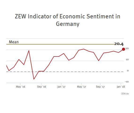 ZEW Indicator of Economic SentimentThe ZEW Indicator of Economic Sentiment for Germany climbed 3.0 points in January 2018, currently standing at 20.4 points. The indicator thus still remains slightly below the long-term average of 23.7 points. The assessment of the current economic situation in Germany increased by 5.9 points, with the corresponding indicator currently standing at 95.2 points.