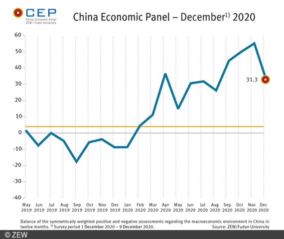 In the December survey (1–9 December 2020), the CEP indicator decreased by 23.7 points to a new reading of 31.3 points. Although this marks a sharp decline, expectations are still at a historically high level. The CEP indicator, based on the China Economic Panel (CEP) in cooperation with Fudan University, Shanghai, reflects the economic expectations of international financial market experts for China on a 12-month basis.
