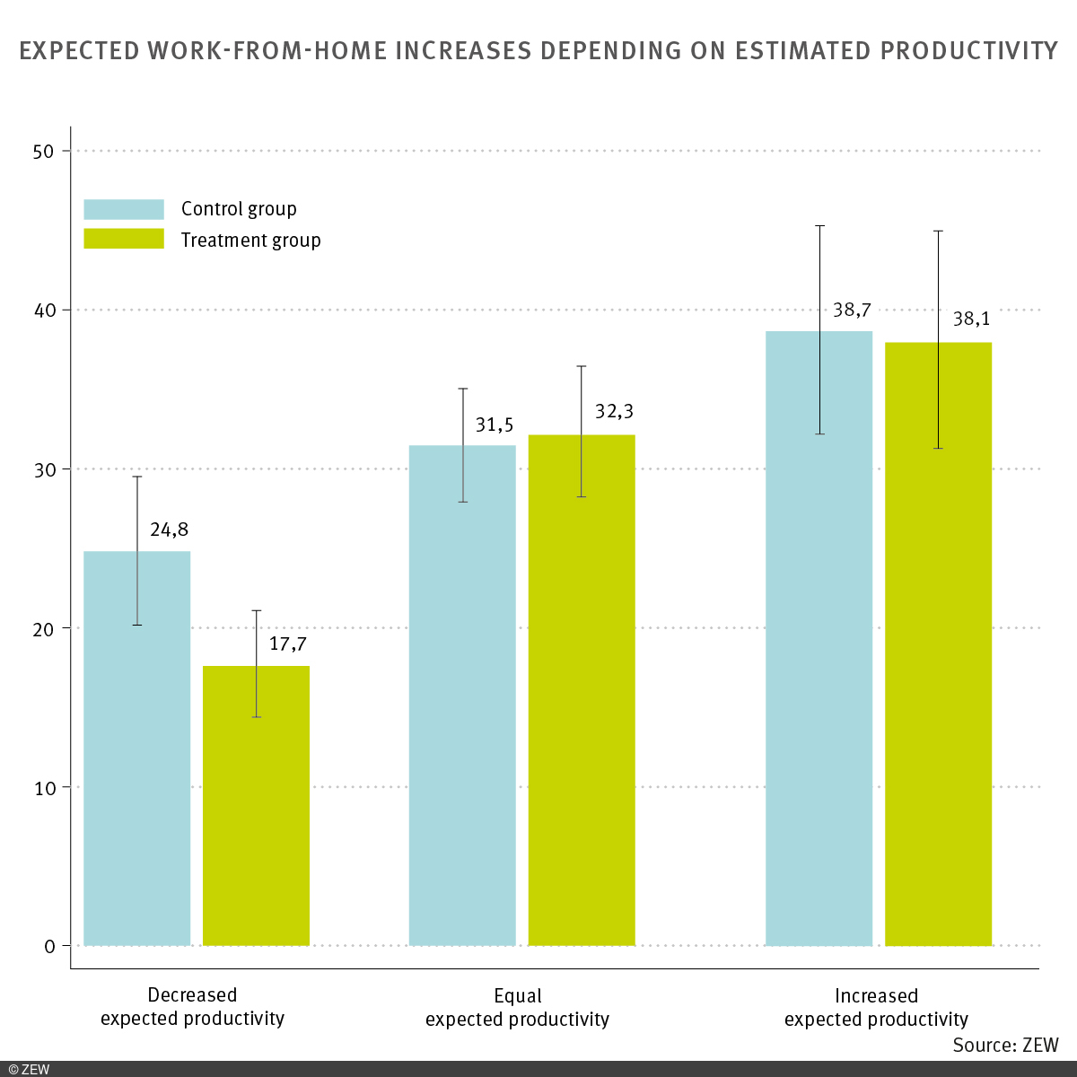 The expected work-from-home increase is calculated from the difference between firms’ expected share of employees who work from home at least once a week after the pandemic and the share before the pandemic. Expected productivity is based on the expected productivity of work-from-home employees compared to their on-site peers. Firms in the control group were first asked about productivity after questions pertaining to their work-from-home plans and vice versa for the treatment group. The vertical lines portray 90% confidence intervals. Source: ZEW Business Survey in the Information Economy.