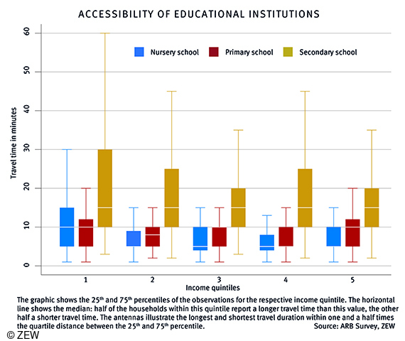 Similar correlations between household income and travel time have also been found for primary and secondary schools. On average, the trip to primary school takes nine minutes, with pupils from the poorest 20 per cent of households having longer journeys than all others. This correlation is particularly strong for secondary schools. The average journey to secondary school takes 18 minutes. Pupils from the poorest 20 per cent of households, on the other hand, live on average about five minutes longer away from the secondary school than all other households. “The differences for individual distances do not seem too great. However, with about 200 school days per year, the two times five minutes per day mean an additional time burden of 2,000 minutes, which is about 33 hours per year,” says ZEW researcher and study author Professor Holger Stichnoth.