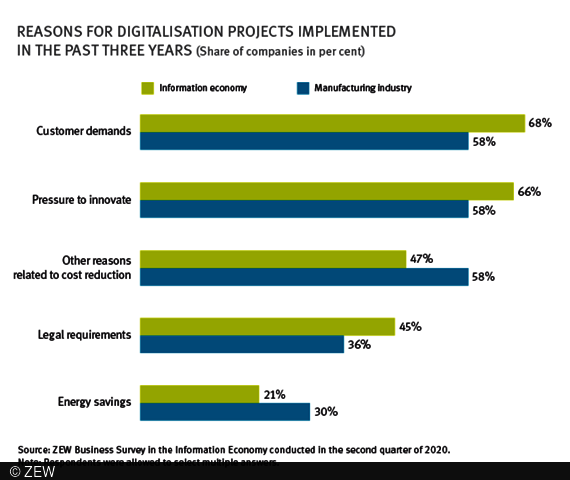 Businesses have so far been rather hesitant to introduce digital technologies that reduce energy consumption, although there are many ways to apply these technologies. Only one third of companies in the manufacturing sector and around 20 per cent of companies in the information economy cited energy savings as a reason for implementing digitalisation measures. These are some of the findings of a study on digitalisation and energy efficiency published today, which was conducted by ZEW Mannheim together with IW Consult and the Institute for Industrial Management FIR at RWTH Aachen University on behalf of the Federal Ministry for Economic Affairs and Energy.