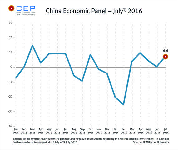 The recent survey carried out in July (18 – 27/07/2016) indicates a recovery in expectations for the Chinese economy. The CEP Indicator, which reflects the expectations of international financial market experts regarding China’s macroeconomic development over the coming twelve months, has increased to a current total of 6.6 points. The indicator previously totalled 0 points.