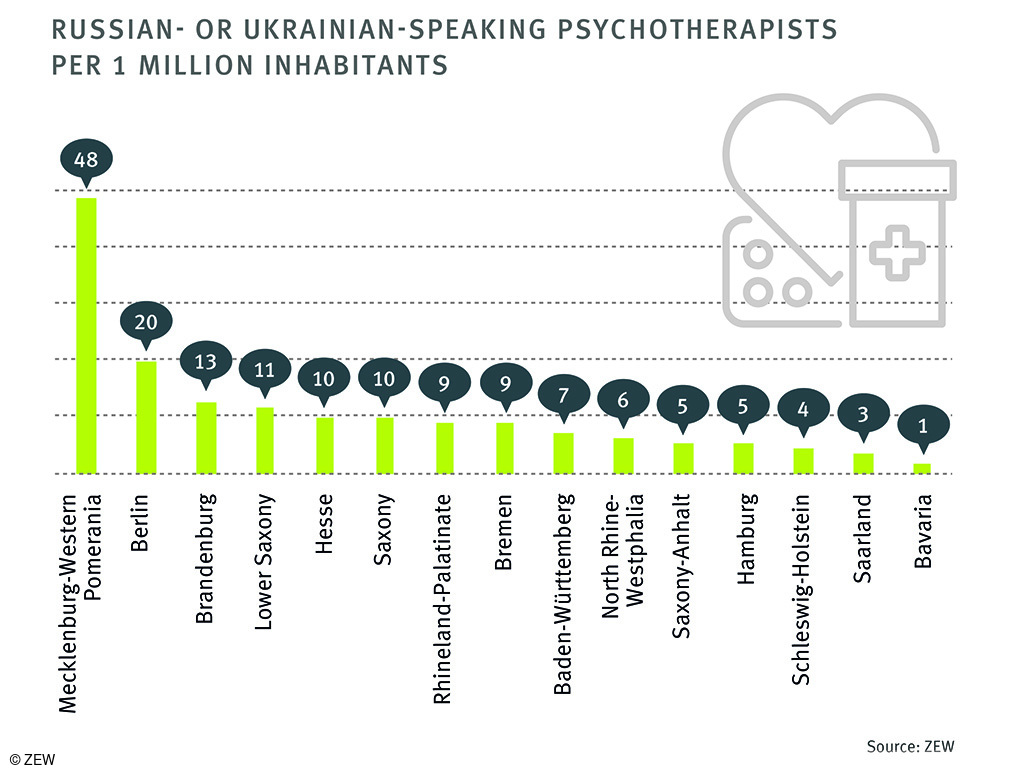However, the existing language barrier should not be underestimated: While interpreters can facilitate communication in the treatment of physical illnesses, for example, it is a challenge to establish a relationship of trust with psychotherapists in this way. Of the 17 associations of statutory health insurance physicians to which most practices belong, 16 (all except Thuringia) enable patients to search for doctors with certain language skills. However, since this information is difficult to obtain, the ZEW economists created an easily accessible and simplified map containing all psychotherapists who speak Ukrainian or Russian.