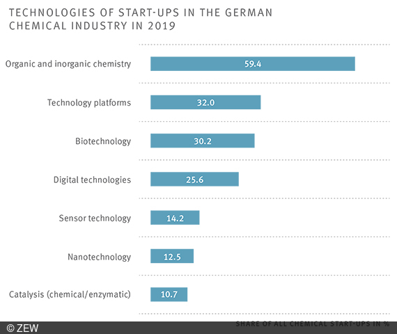 In their study, the researchers defined chemical start-ups as young companies that offer innovative products and services for the chemical industry on the basis of chemistry-specific knowhow or chemical technology. The firm-level data analysed in this study stems from the Mannheim Enterprise Panel of ZEW as well as from a list of chemical start-ups compiled by “Forum Startup Chemie”, an initiative to support start-up companies in the chemical industry. The researchers identified a total of 281 chemical start-ups that were active at the beginning of 2019. A central feature of these start-ups is their focus on innovation.