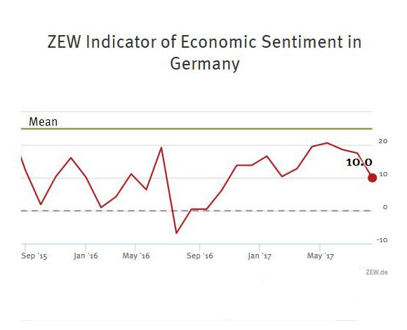 ZEW Indicator of Economic SentimentThe ZEW Indicator of Economic Sentiment for Germany fell considerably by 7.5 points in August 2017 and now stands at 10.0 points. The indicator thus remains significantly below the long-term average of 23.8 points. The assessment of the current economic situation in Germany increased slightly by 0.3 points in August. The corresponding indicator now stands at 86.7 points.