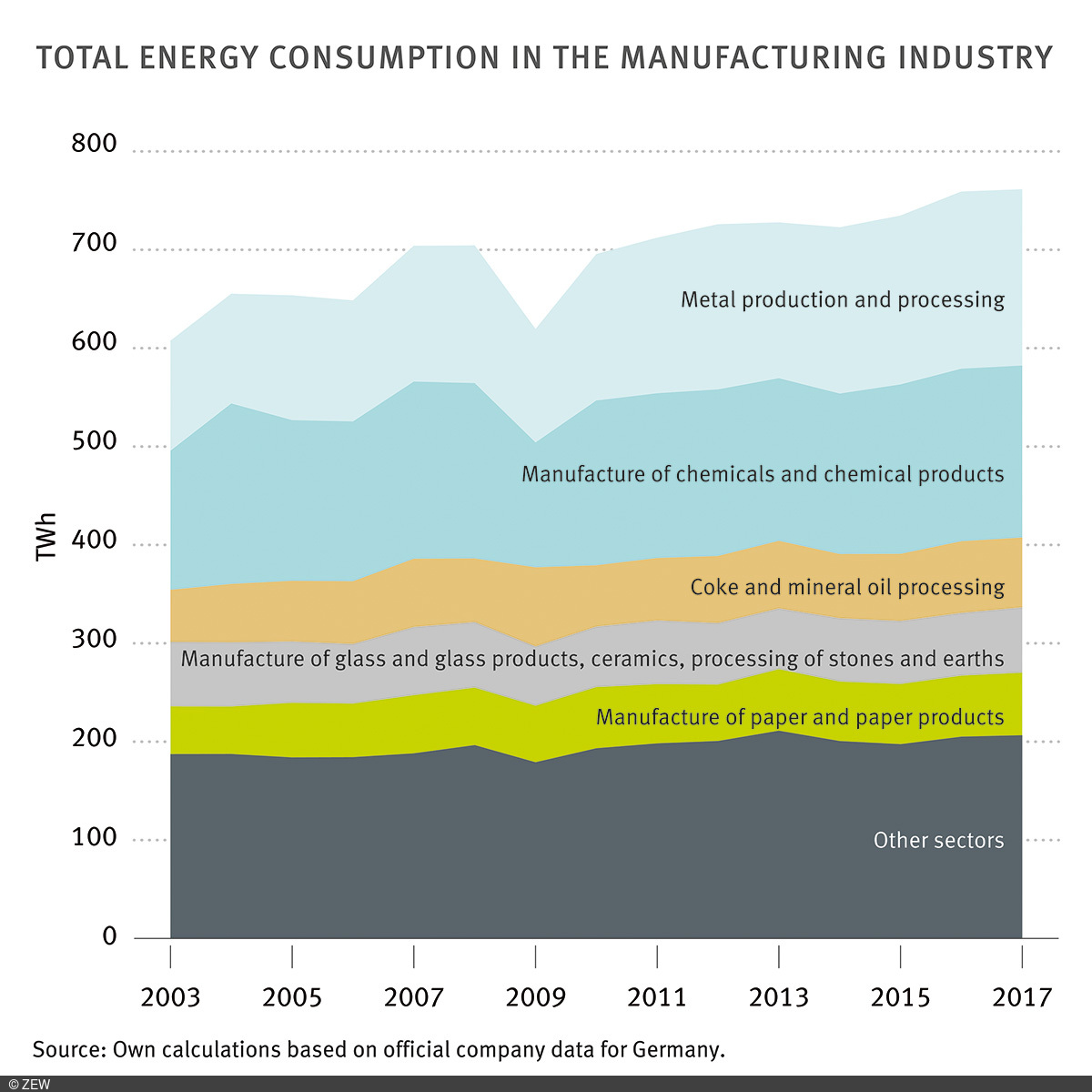 Energy-intensive sectors such as glass, paper, chemicals, and steel account for more than two-thirds of the total energy consumption in the manufacturing industry. Despite emissions trading and the EEG levy, from which some businesses were exempt, these sectors have actually increased their energy consumption in recent years up until 2017, rather than reducing it.