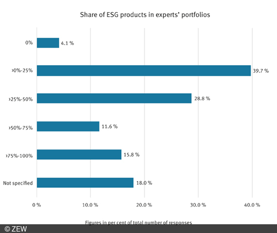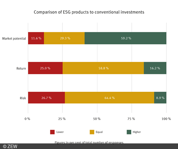 ResearchSustainable investments (ESG investment products) are becoming more relevant for financial market experts. This is the result of a special question featured in the most recent ZEW Financial Market Survey conducted among approximately 150 financial market experts. Around 59 per cent see greater market potential for ESG products than for conventional investments. According to the respondents, ESG products are also associated with a similar ratio between risk and return as conventional investment products. Two thirds of the experts want to have ESG investment products in their own portfolios, even if only to a share of less than 50 per cent. However, the majority of the participants hold the view that social and ecological aspects are addressed only insufficiently by ESG investment products. The survey was conducted by ZEW Mannheim in September 2020.