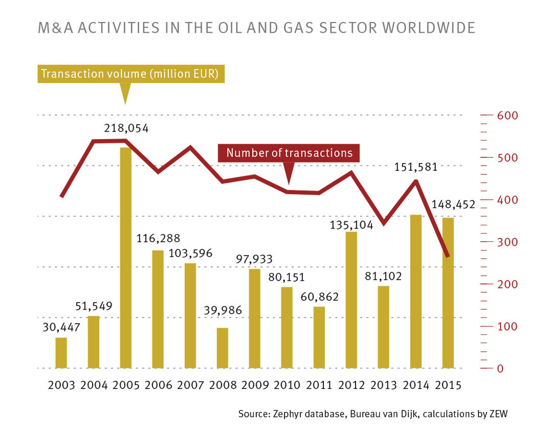 ResearchThree megadeals closed in the US within the past year ensured that the global transaction volume for merger and acquisition activities in the oil and gas sector remained high. With a global transaction volume of 151 billion euros, 2014 has been a record-breaking year but with 148 billion euros the year 2015 remains only close behind. With deal volumes of 20, 18 and 16 billion euros respectively, the three megadeals executed in the US made up for more than a third of the total global transaction volume in 2015. Indeed, these transactions were the third, fourth and fifth largest transactions ever recorded in the American market. These are the results of recent studies accomplished by the Centre for European Economic Research (ZEW), based on the Zephyr database of Bureau van Dijk (BvD).