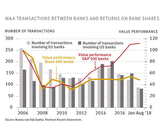 Between January and August 2018, US banks saw 64 M&A transactions, down from the 75 transactions in the previous year. This is somewhat surprising because tax reform and bank deregulation have increased the ease and desirability of acquiring US banks. In the medium term, these factors are expected to have a positive effect on M&A activities. In the EU, the same period saw 45 transactions (versus 42 in the previous year). In the EU as well, more transactions are expected in the medium term, though the primary concern acting as a driving force here is maintaining competitiveness.