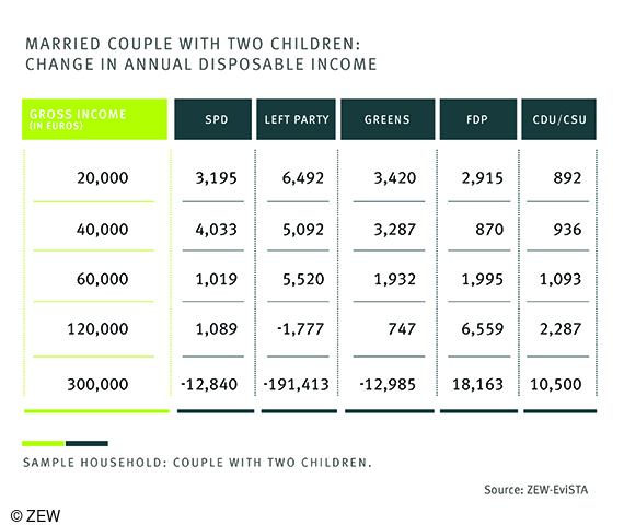 Instead of suggesting redistribution measures, the CDU/CSU and FDP want to relieve the tax burden on all households, but especially on high-income households. The disposable income of a household consisting of a married couple with two children with an annual gross family income of 300,000 euros would increase by 11,000 to 18,000 euros, while it would decrease under the programmes of SPD, the Greens and the Left Party.