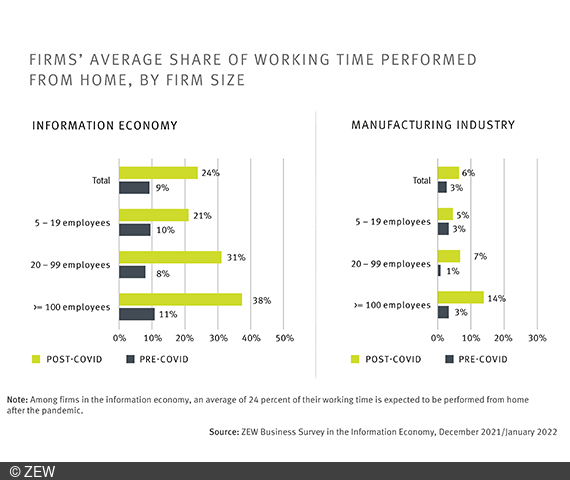 “Before the pandemic, only in one out of ten firms in the information economy did work from home account for more than 30 per cent of total working time. For the period after the pandemic, however, one third of the firms now expect such a high share of home-based working time. The corresponding share of firms has thus tripled in the course of the pandemic,” says Erdsiek. Overall, 15 per cent of the firms even expect that in the long run more than half of the total working time will be done from home. Here, too, the expectations correspond to three times the pre-crisis level. In manufacturing, on the other hand, only a few firms expect more than 30 per cent or even 50 per cent of working time to be performed from home after the pandemic. However, almost one in five firms expect more than 10 per cent of working time to be performed from home after the pandemic (compared to only 4 per cent of firms before COVID).