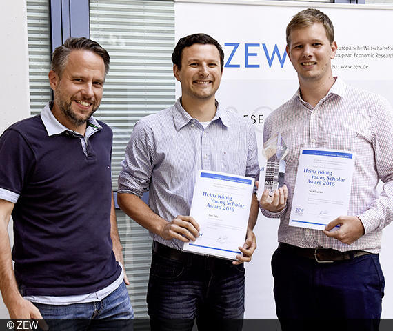 The winners Jan Tilly (middle) and Nick Frazier (right) together with Andreas Peichl, head of ZEW Research Group \\"International Distribution and Redistribution\\".