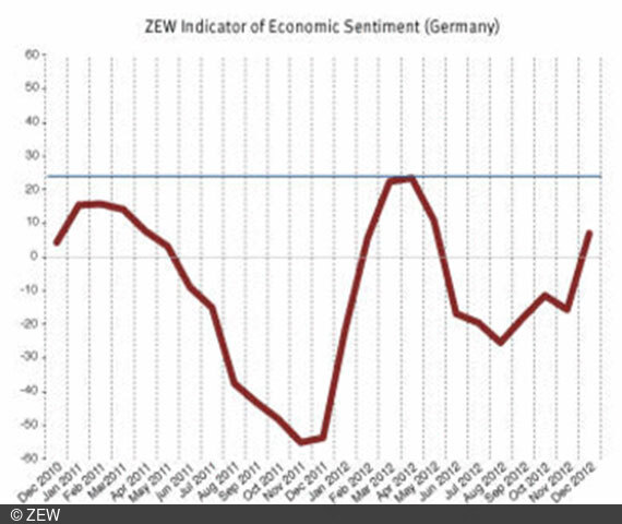 ZEW Indicator of Economic SentimentThe ZEW Indicator of Economic Sentiment for Germany has increased by 22.6 points in December 2012. It now stands at a level of 6.9 points, thereby reaching positive territory for the first time since May 2012.