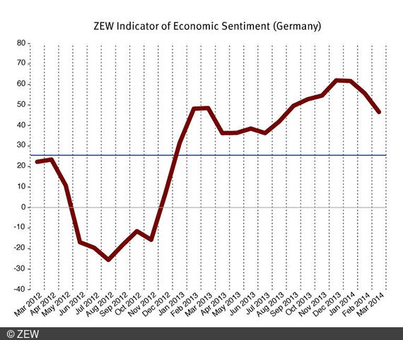 ZEW Indicator of Economic SentimentEconomic Expectations for Germany have worsened in March 2014. The ZEW Indicator of Economic Sentiment has decreased by 9.1 points and now stands at a level of 46.6 points (historical average: 24.6 points). "In this month’s survey the Crimea Crisis is weighing on experts’ economic expectations for Germany. Nevertheless, the indicator’s level suggests that the economic upswing is currently not at risk,” says ZEW President Prof. Dr. Clemens Fuest.