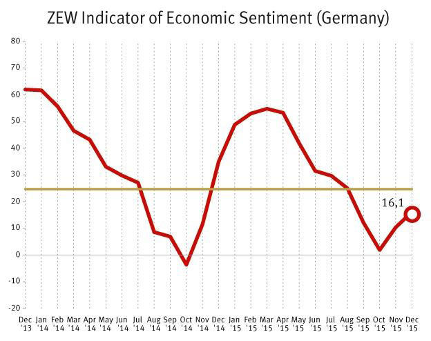 ZEW Indicator of Economic SentimentThe ZEW Indicator of Economic Sentiment for Germany has increased for the second consecutive time in December 2015. Gaining 5.7 points compared to the previous month, the index now stands at 16.1 points (long-term average: 24.7 points).