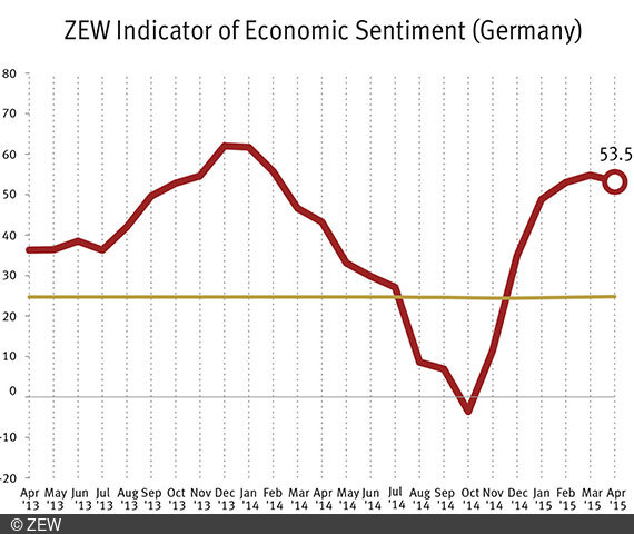 ZEW Indicator of Economic SentimentIn April 2015, the ZEW Indicator of Economic Sentiment for Germany fell for the first time since October 2014. Compared to the previous month, the indicator has declined by 1.5 points to a reading of 53.3 points (long-term average: 24.8 points).