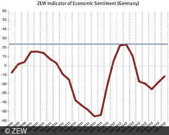 The ZEW Indicator of Economic Sentiment for Germany has increased by 6.7 points in October 2012. It is now standing at a level of minus 11.5 points. This is the second increase of the indicator in a row.