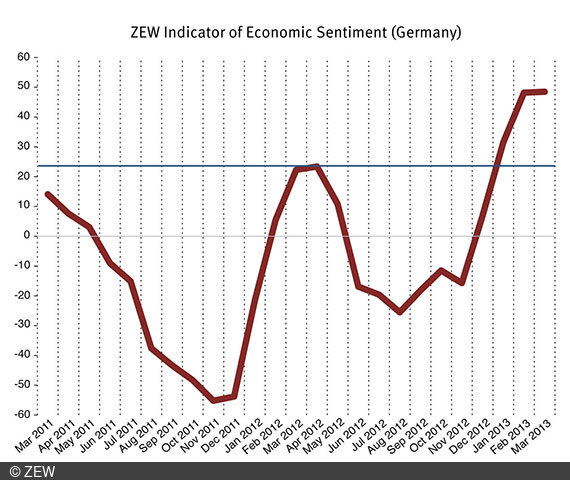 ZEW Indicator of Economic SentimentThe ZEW Indicator of Economic Sentiment for Germany has increased by 0.3 points in March 2013. The indicator now stands nearly unchanged at a level of 48.5 points. Hence, after three substantial increases between December 2012 and February 2013, the indicator has stabilised in March at a respectable level.