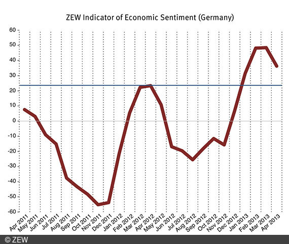 ZEW Indicator of Economic SentimentIn April 2013 the ZEW Indicator of Economic Sentiment for Germany has fallen by 12.2 points and is now at a level of 36.3 points. Despite its decline, the indicator currently hovers at its third highest mark within the last 24 months. The current level has only been exceeded in the two preceding months.