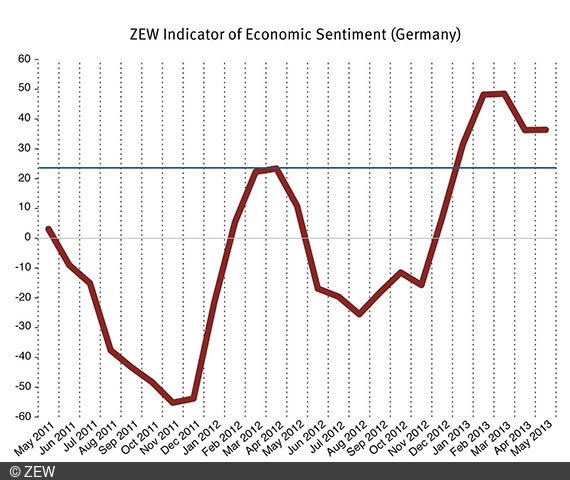 ZEW Indicator of Economic SentimentAfter a sharp decline last month, the ZEW Indicator of Economic Sentiment for Germany moved sideways in May 2013. The indicator gained 0.1 points compared to the previous month and is now hovering at the 36.4-points mark.