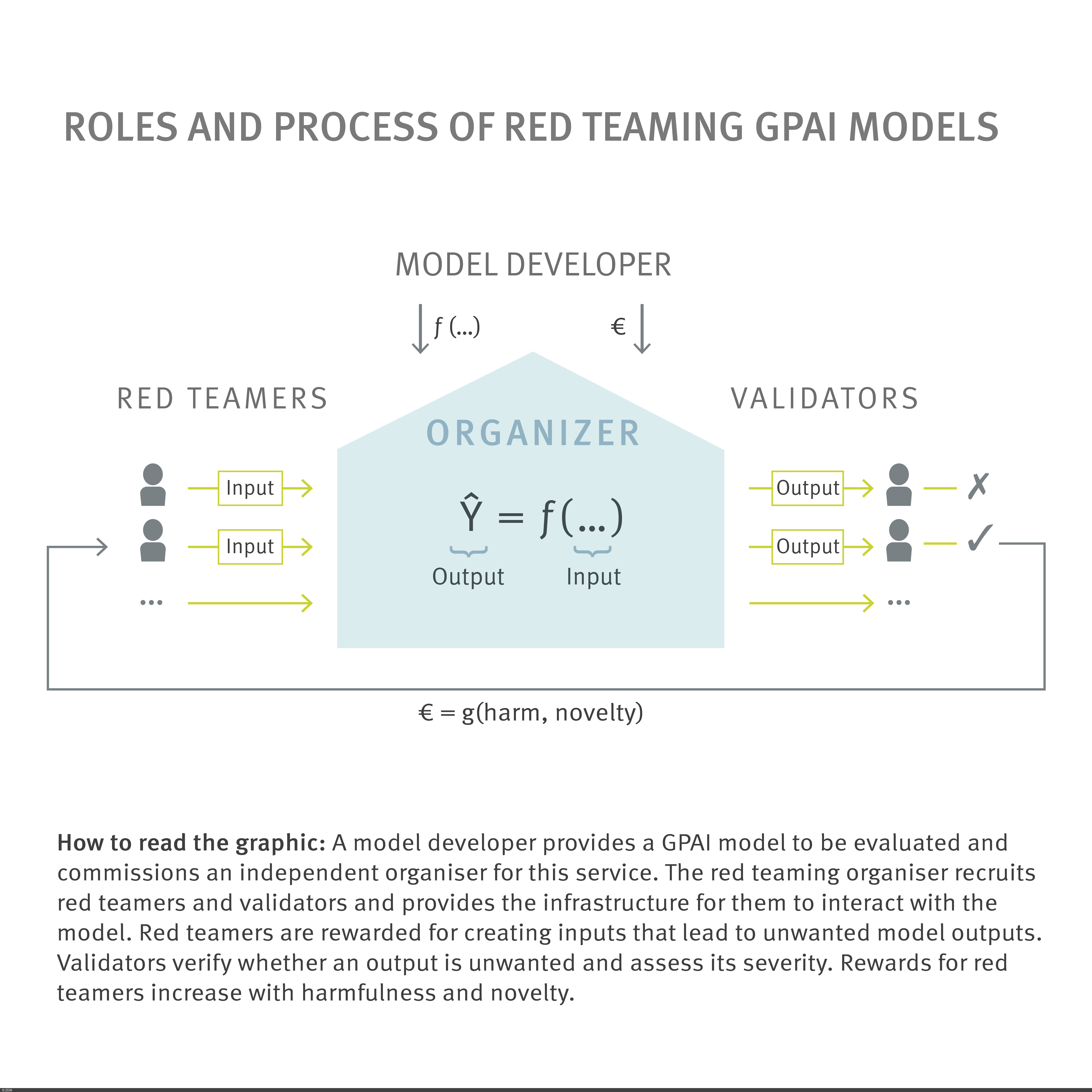 Accordingly, clear structures and roles need to be defined for red teaming to realise its potential efficiently. The ZEW researchers propose four defined roles, each with its own tasks, goals, and incentives to ensure an efficient evaluation process. These roles include 1) the organisers of the evaluation, 2) the red teamers, 3) validators who determine whether unwanted behaviour has been found, and 4) the AI development team. Each of these roles should be filled by independent entities, e.g. to ensure that the red team has an incentive to fulfil its task in the best possible way.