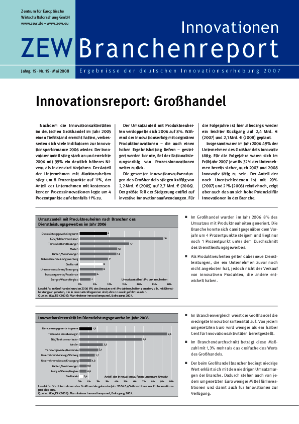 Nachdem die Innovationsaktivitäten im deutschen Großhandel im Jahr 2005 einen Tiefststand erreicht hatten, verbesserten sich viele Indikatoren zur Innovationsperformance 2006 wieder. Der Innovatorenanteil stieg stark an und erreichte 2006 mit 39% ein deutlich höheres Niveau als in den drei Vorjahren. Der Anteil der Unternehmen mit Marktneuheiten stieg um 8 Prozentpunkte auf 11%, der Anteil der Unternehmen mit kostensenkenden Prozessinnovationen legte um 4 Prozentpunkte auf ebenfalls 11% zu. Der Umsatzanteil mit Produktneuheiten verdoppelte sich 2006 auf 8%. Während der Innovationserfolg mit originären Produktinnovationen – die auch einen hohen Ergebnisbeitrag liefern – gesteigert werden konnte, fiel der Rationalisierungserfolg von Prozessinnovationen weiter zurück.Die gesamten Innovationsaufwendungen des Großhandels stiegen kräftig von 2,2 Mrd. € (2005) auf 2,7 Mrd. € (2006). Der größte Teil der Steigerung entfiel auf investive Innovationsaufwendungen. Für die Folgejahre ist hier allerdings wiederein leichter Rückgang auf 2,4 Mrd. € (2007) und 2,1 Mrd. € (2008) geplant. Insgesamt waren im Jahr 2006 49% der Unternehmen des Großhandels innovativ tätig. Für die Folgejahre waren sich im Frühjahr 2007 jeweils 32% der Unternehmen bereits sicher, auch 2007 und 2008 innovativ tätig zu sein. Der Anteil der noch Unentschiedenen ist mit 20% (2007) und 21% (2008) relativ hoch, zeigt aber auch das an sich hohe Potenzial für Innovationen in der Branche.