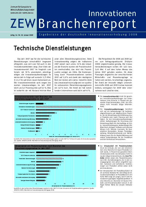Das Jahr 2007 war für die technischen Dienstleistungen wirtschaftlich insgesamt erfolgreich, was sich zum Teil auch in den Innovationsaktivitäten zeigt. Zwar blieb der Innovatorenanteil 2007 im Vergleich zum Vorjahr mit 59% unverändert, allerdings stiegen die Innovationsaufwendungen im vierten Jahr in Folge auf nunmehr 3,75 Mrd. € (+1,5%) auf einen neuen Spitzenwert an. Die Innovationsintensität sank wegen des starken Umsatzanstieges im Jahr 2007 leicht um 0,3 Prozentpunkte auf 9,3%. Dies ist weiterhin der mit Abstand höchste Wert unter allen Dienstleistungsbranchen. Beim Innovationserfolg zeigten die Indikatoren 2007 jedoch nach unten. 14% des Umsatzes der Branche wurden mit Produktneuheiten erwirtschaftet, das sind vier Prozentpunkte weniger als 2006. Die Kostensenkung durch Prozessinnovationen sanken 2007 auf 1,8% und damit den niedrigsten Wert der letzten zehn Jahre. Immerhin blieb das Umsatzwachstum aufgrund von qualitativ verbesserten Dienstleistungsangeboten mit 3,0% hoch. Der Anteil der FuE betreibenden Unternehmen sank leicht auf 43%. Die Perspektiven für 2008 und 2009 waren zum Befragungszeitpunkt (Frühjahr 2008) vergleichsweise günstig. Die Innovationsaufwendungen sollten mit 3,63 bzw. 3,65 Mrd. € auf dem hohen Niveau des Jahres 2007 gehalten werden. Ob diese Planungen angesichts der verschlechterten Wirtschafts- und Finanzierungslage zu halten sein werden, ist allerdings ungewiss. Der Anteil der innovativ tätigen Unternehmen dürfte 2008 und 2009 in etwa konstant bleiben, wenngleich für 2009 viele Unternehmen noch unsicher sind.