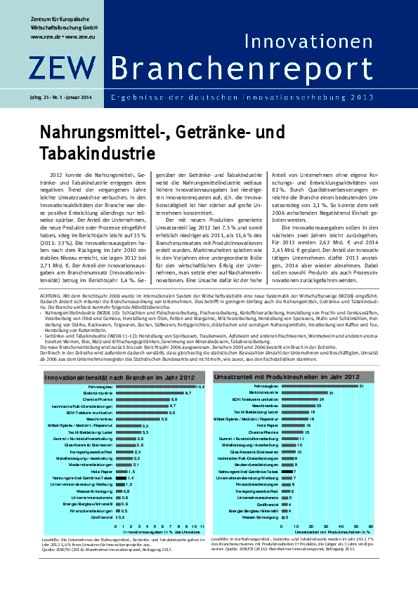 2012 konnte die Nahrungsmittel-, Getränke-und Tabakindustrie entgegen dem negativen Trend der vergangenen Jahre leichte Umsatzzuwächse verbuchen. In den Innovationsaktivitäten der Branche war diese positive Entwicklung allerdings nur teilweise spürbar. Der Anteil der Unternehmen, die neue Produkte oder Prozesse eingeführt haben, stieg im Berichtsjahrleicht auf 35% (2011: 33%). Die Innovationsausgaben haben nach dem Rückgang im Jahr 2010 ein stabiles Niveauerreicht, sie lagen 2012 bei 2,71 Mrd. €. Der Anteil der Innovationsausgaben am Branchenumsatz (Innovationsintensität) betrug im Berichtsjahr 1,4%. Gegenüber der Getränke-und Tabakindustrie weist die Nahrungsmittelindustrie weitaus höhere Innovationsausgaben bei niedrigeren Innovatorenquoten auf, d.h. die Innovationstätigkeit ist hier stärker auf große Unternehmen konzentriert. Der mit neuen Produkten generierte Umsatzanteil lag 2012 bei 7,5% und somit erheblich niedriger als 2011, als 11,6% des Branchenumsatzes mit Produktinnovationen erzielt wurden. Marktneuheiten spielten wie in den Vorjahren eine untergeordnete Rolle für den wirtschaftlichen Erfolg der Unternehmen, man setzte eher auf Nachahmerinnovationen. Eine Ursache dafür ist der hohe Anteil von Unternehmen ohne eigene Forschungs- und Entwicklungsaktivitäten von 82%. Durch Qualitätsverbesserungen erreichte die Branche einen bedeutenden Umsatzanstieg von 2,1%. So konnte dem seit 2006 anhaltenden Negativtrend Einhalt geboten werden. Die Innovationsausgaben sollen in den nächsten zwei Jahren leicht zurückgehen. Für 2013 werden 2,62 Mrd. € und 2014 2,45 Mrd. € geplant. Der Anteil der innovativ tätigen Unternehmen dürfte 2013 ansteigen, 2014 aber wieder abnehmen. Dabei sollen sowohl Produkt- als auch Prozessinnovationen zurückgefahren werden.