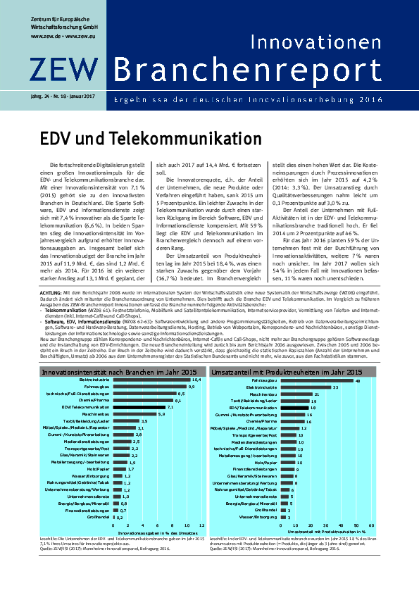 Die fortschreitende Digitalisierung stellt einen großen Innovationsimpuls für die EDV- und Telekommunikationsbranche dar. Mit einer Innovationsintensität von 7,1 % (2015) gehört sie zu den innovativsten Branchen in Deutschland. Die Sparte Software, EDV und Informationsdienste zeigt sich mit 7,4 % innovativer als die Sparte Telekommunikation (6,6 %). In beiden Sparten stieg die Innovationsintensität im Vorjahresvergleich aufgrund erhöhter Innnovationsausgaben an. Insgesamt belief sich das Innovationsbudget der Branche im Jahr 2015 auf 11,9 Mrd. €, das sind 1,2 Mrd. € mehr als 2014. Für 2016 ist ein weiterer starker Anstieg auf 13,1 Mrd. € geplant, der sich auch 2017 auf 14,4 Mrd. € fortsetzen soll.