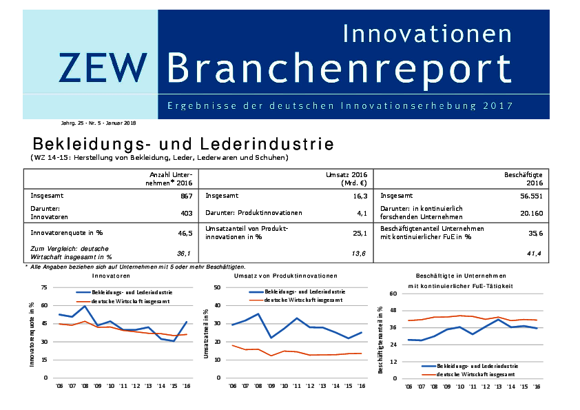 Der Branchenreport Innovation für die Branche Bekleidungs- und Lederindustrie stellt die Innovationsleistung der Branche im Jahr 2016 dar. Der Anteil der Unternehmen mit Innovationen lag bei 46,5 %. Die Innovationsausgaben stiegen gegenüber dem Vorjahr um 6 % auf 0,61 Mrd. €. 11 % der Unternehmen wiesen eine kontinuierliche FuE-Tätigkeit auf. Der Beschäftigungsanteil von Unternehmen mit kontinuierlicher FuE betrug 35,6 %.