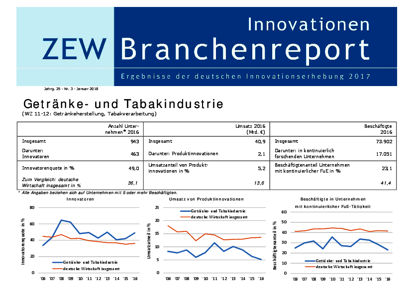 Der Branchenreport Innovation für die Branche Getränke- und Tabakindustrie stellt die Innovationsleistung der Branche im Jahr 2016 dar. Der Anteil der Unternehmen mit Innovationen lag bei 49 %. Der Anteil der Innovationsausgaben am Branchenumsatz (Innovationsintensität) belief sich im Berichtsjahr auf 1,1 %. Der Umsatzanteil mit Produktinnovationen betrug 2 %.